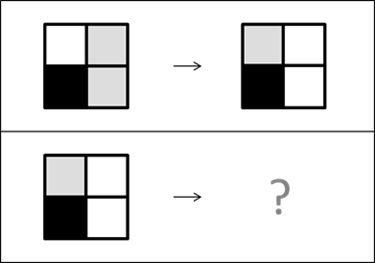 Now, for our question in the bottom row, we need to apply these same rules to find the answer. Looking at choice #5, we can see it follows our rules perfectly - the white squares became grey, the grey squares became white, and the black square stayed black.